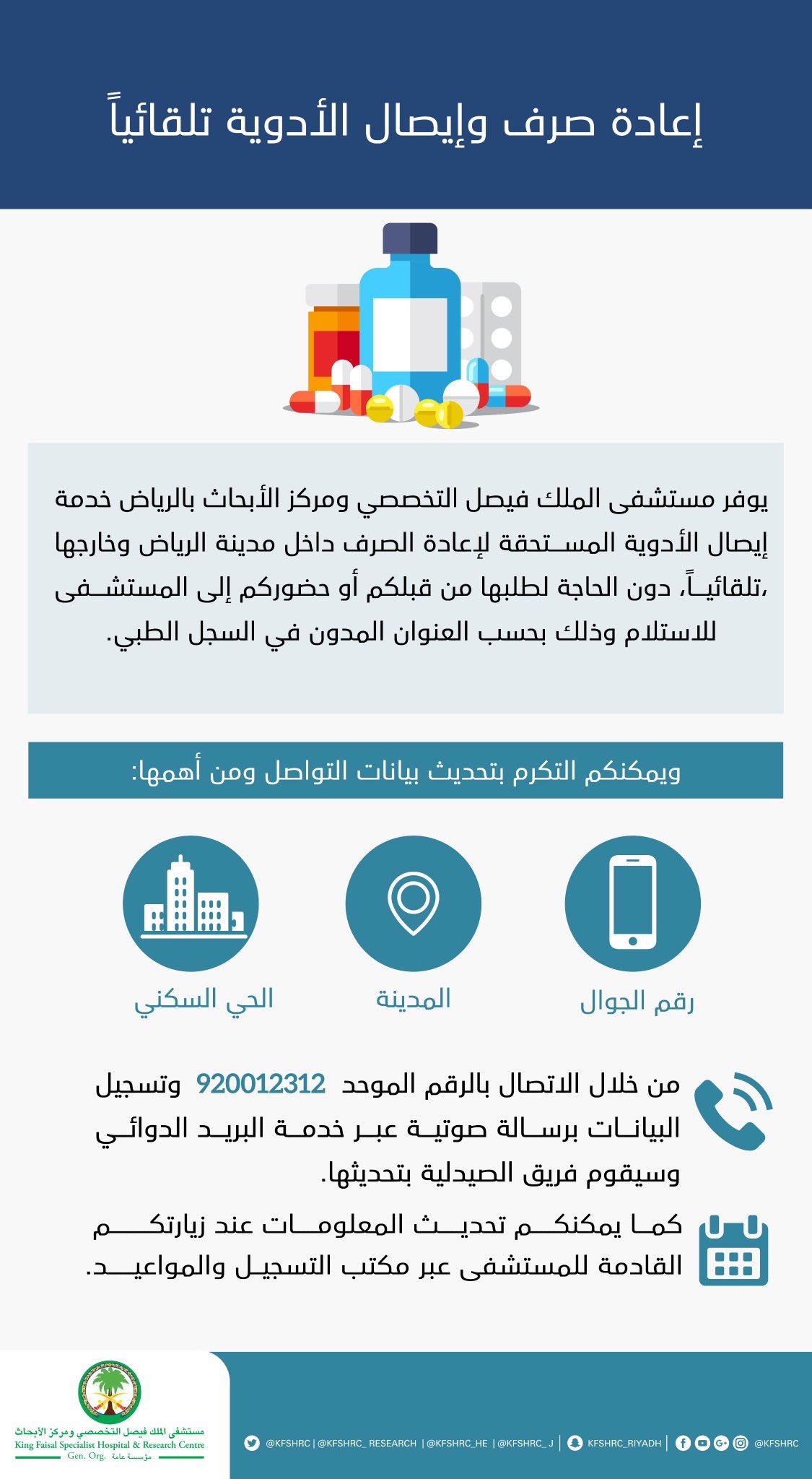 مستشفى الملك فيصل ا لـ تـ خـ صـ صـ ي بالرياض On Twitter يوفر مستشفى الملك فيصل التخصصي بالرياض خدمة إيصال الأدوية المستحقة لإعادة الصرف للمرضى داخل مدينة الرياض وخارجها تلقائي ا دون الحاجة لطلبها