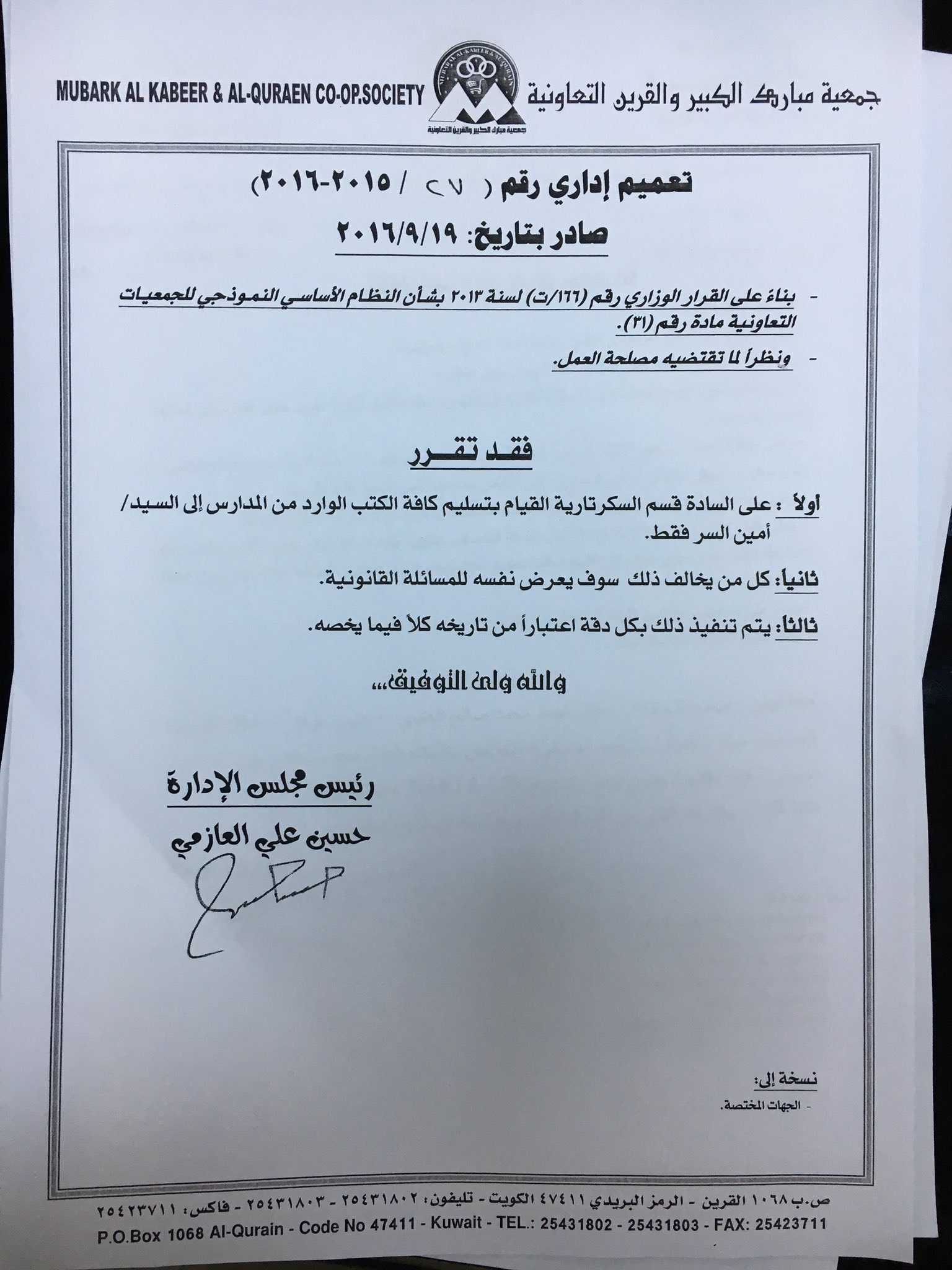 جمعية مبارك الكبير و القرين التعاونية على تويتر طبقا لقرارات وزارة الشؤون بدعم العمليه التربويه تسلم كتب المدارس التابعه لمنطقة عمل الجمعيه ل أمين سر مجلس الاداره