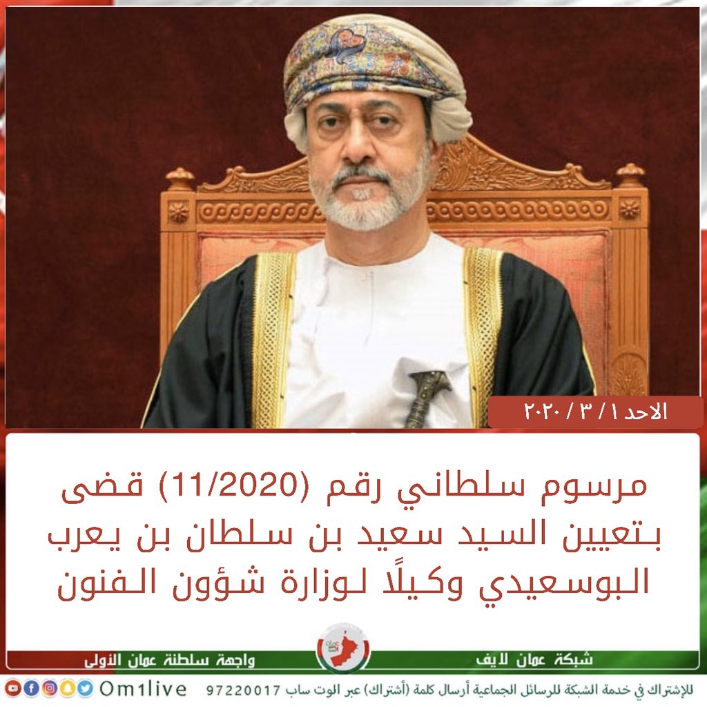 وكالة الأنباء العمانية On Twitter وقضى المرسوم الثامن بتعيين السيد سعيد بن سلطان بن يعرب البوسعيدي وكيل ا لوزارة شؤون الفنون فيما قضى المرسوم التاسع بتعيين السيد فيصل بن حمود بن نصر البوسعيدي